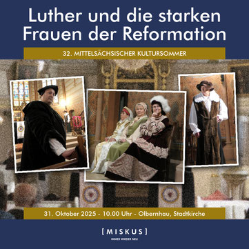 Ohne Zweifel gilt der Mönch Martin Luther als der Initiator und Vater der kirchlichen Reformation. Aber nicht nur er, sondern auch wirkmächtige Frauen mischten sich aktiv mit ein und hatten somit einen nicht zu unterschätzenden Anteil an deren Einführung im albertinischen Sachsen. Dieses Stück deutscher Geschichte präsentieren die Miskus-Mimen in kleinen szenischen Lesungen.